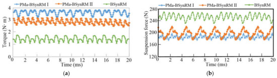 The torque and suspension force of three motors at a 45° load angle are listed in Table 2. Figure 12 illustates the waveforms of torque and suspension force of the two PMa-BSynRMs and the BSynRM at a 45° load angle. By analyzing the waveform in Figure 12a, it can be found that the torque ripple of the PMa-BSynRM I was 16.52%, which was lower than the PMa-BSynRM II of 21.97% and the BSynRM of 52.11%. Consequently, the PMa-BSynRM I not only has relatively large torque, but also has advantages in torque ripple.