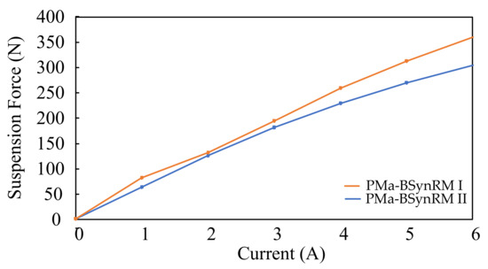 In Figure 12b, it is found that although the suspension force of the PMa-BSynRM I is slightly smaller than that of the PMa-BSynRM II and the smallest of three, the suspension force ripple of the PMa-BSynRM I was 11.68% lower than that of BSynRM and PMa-BSynRM II, 15.14% and 23.88%, respectively. Owing to the fact that the suspension force is engendered by the superposition of torque flux and suspension force flux, compared with BSynRM, the suspension force flux of PMa-BSynRM passed through thick permanent magnets and non-magnetic materials, so the suspension force of unit suspension force winding MMF was smaller. In order to compare the suspension force of PMa-BSynRM I and PMa-BSynRM II in more detail, the average suspension forces versus the current of suspension force windings are shown in Figure 13. It can be seen that as the current of suspension force windings changes, the average suspension force of PMa-BSynRM I is always larger than that of PMa-BSynRM II.