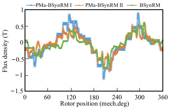 The air gap flux density curves under the load of the three motors are depicted in Figure 15. Because the torque windings and the suspension force windings were electrified at the same time, the resultant produced by the air gap flux density under no load and the stator magnetic field mean that the air gap flux density under load was very different from the air gap flux density under no load. However, the air gap flux density of PMa-BSynRM I was still larger than that of the PMa-BSynRM II and BSynRM.