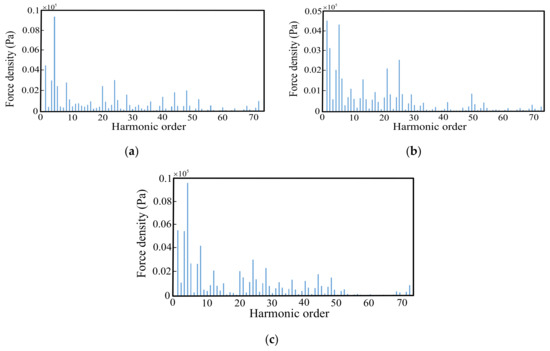 Harmonic analysis of radial force under load of three motors. (a) PMa-BSynRM I. (b) PMa-BSynRM II. (c) BSynRM.