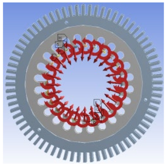 The total nodal force acting on the stator teeth of the three motors was mapped onto the vibration models, respectively, as shown in Figure 18. Finally, the vibration acceleration and displacement of the three motors at 3000 r/min calculated by the FEA software are, respectively, illustrated in Figure 19 and Figure 20.