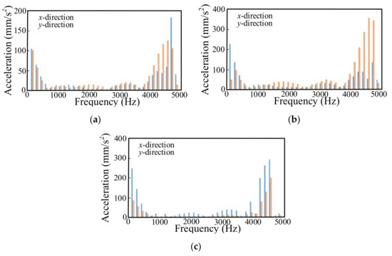 Vibration acceleration of three motors under load at 3000 r/min. (a) PMa-BSynRM I; (b) PMa-BSynRM II; (c) BSynRM.