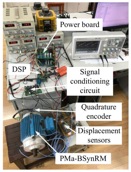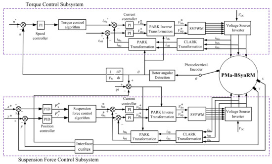 - Zhang, H.; Zhu, H.; Zhang, Z.; Xie, Z. Design and simulation of control system for bearingless synchronous reluctance motor. In Proceedings of the 2005 International Conference on Electrical Machines and Systems, Nanjing, China, 27–29 September 2005; pp. 554–558. [Google Scholar] [CrossRef]