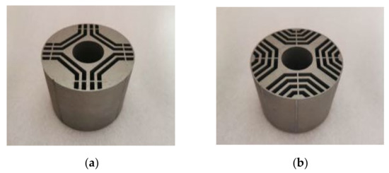 Rotors of two prototypes. (a) Rotor of PMa-BSynRM I; (b) rotor of PMa-BSynRM II.