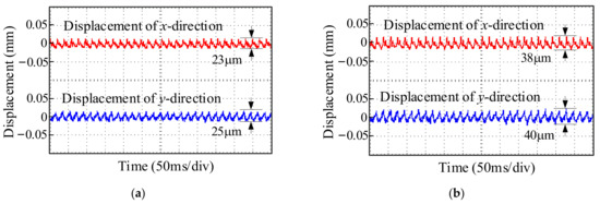 The rotor radial displacement curves when the two motors were running at 3000 r/min and stably suspended are shown in Figure 25. It can be seen that the rotor can be suspended near the balanced position. Because the suspension force ripple of the PMa-BSynRM I is smaller than that of the PMa-BSynRM II, the radial displacement fluctuations decreased by 39.4% and 37.5% for PMa-BSynRM I and PMa-BSynRM II, respectively.