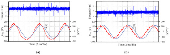 The power factor is achieved by measuring the phase difference between the motor voltage and current. The results are shown in Figure 27. After calculation, the power factors of PMa-BSynRM I and PMa-BSynRM II were 88.3% and 78.8%, respectively, which are in line with the simulation results.