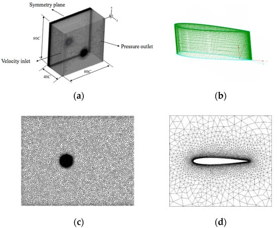 The real 3D NACA0012 airfoil simulation share nearly the same numerical method as that of the pseudo 3D NACA0012 airfoil. The geometry structure and the mesh structure are showed in Figure 5. Figure 5a is the geometry structure of the airfoil, Figure 5b is the mesh at the end part of the airfoil, Figure 5c is the view of the whole grid zone, and Figure 5d is the airfoil circumferential grid distribution. As shown in Table 1, it is found that the mesh sizes of 3,140,000 and 3,500,000 give nearly the same results with a relative error of less than 1%, thus the mesh size of 3,140,000 is used for the following calculation.