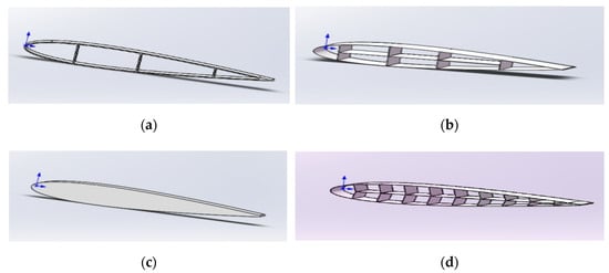Different shapes of the airfoil skeleton models: (a) Skeleton model with three flat plant support in the chord line direction; (b) Skeleton model with flat plant support in both the chord line direction and camber line direction; (c) Skeleton model with solid material in the inner part of the airfoil; (d) Fish skeleton structure support airfoil.