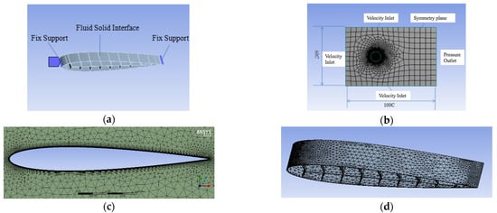The two-way fluid-solid coupling case involves the NACA0012 airfoil with chord length of 1 m and spanwise length of 0.2 m. This section focuses on the study about the aerodynamic performance for the airfoil at the angle of attack and the Young’s modulus of 1 Mpa and 2 Mpa. In this paper, airfoil skeleton models with different shapes, as shown in Figure 6, have been studied by using the model, and it is found that the airfoil shape in Figure 6d which is sampled from the shape of fish seems to be more in line with the bionic principles. The boundary condition of the solid zone, the whole grid structure, the airfoil circumferential grid distribution and the grid distribution of the solid zone are depicted in Figure 7. To ensure the accuracy of calculation, the lift coefficients for different mesh sizes including 400,000, 650,000, 800,000 and 1,500,000 have been calculated, as shown in Table 1. Finally, the mesh with the size of 650,000 is chosen to keep a balance between saving the computational resources and keeping a relatively high level of accuracy.