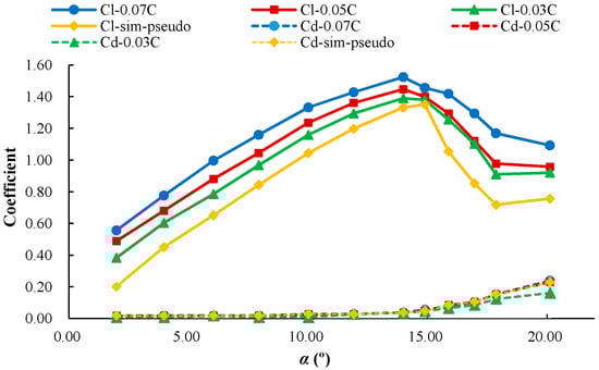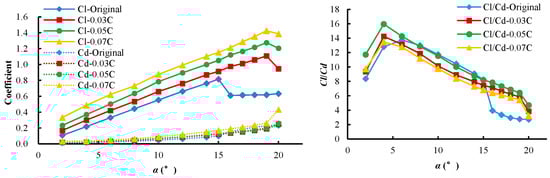 In this section, the lift-drag curves of the real 3D NACA0012 airfoil with the maximum deformation amplitudes of 3%, 5% and 7% of chord length at the angle of attack from 0° to 20° have been calculated and depicted in Figure 13. From this figure, it can be found that the lift coefficient firstly increases and then decreases as the angles of attack augment from 0° to 20°. Compared with the original lift coefficient curve with non-deformation, all the lift coefficient curves with deformation have demonstrated better lift performance. At the same angle of attack, bigger the maximum deformation amplitude, better the lift performance.