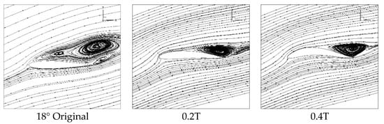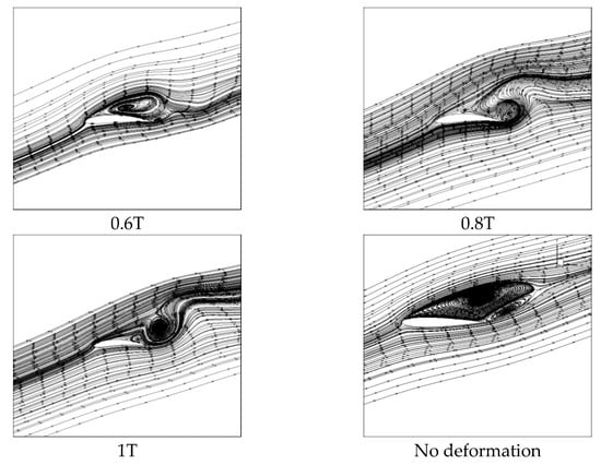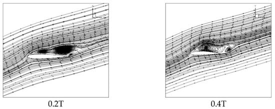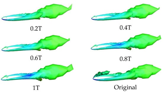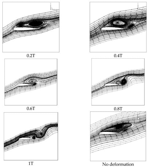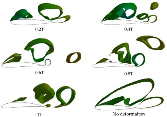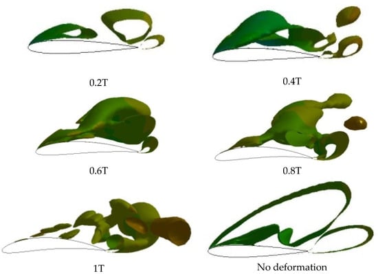 In Figure 16, the surface vortex of the airfoil with the Young’s Modulus of 2 Mpa is greatly reduced in scale when compared with that of the original airfoil.