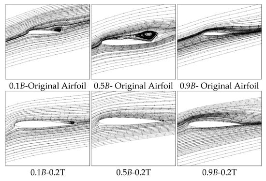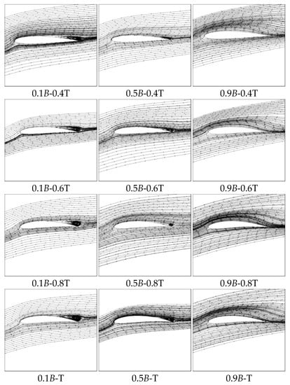 The flow field and vortex are demonstrated in Figure 14 and Figure 15. In Figure 14, 0.1B, 0.5B and 0.9B represent different cross-sections along 10%, 50% and 90% of the airfoil spanwise direction, respectively. From this figure, it can be found out that the restrain of the vortex for 0.1B is not obvious, the restrain of the vortex for 0.5B is very obvious and the vortex has nearly disappeared. No obvious change can be found for the 0.9B case.