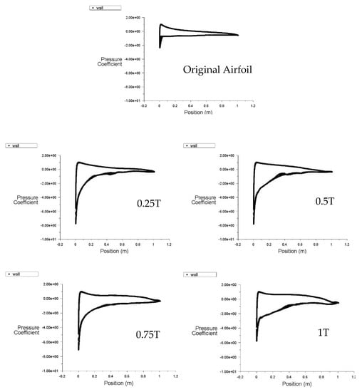 From Figure 16 and Figure 17, it can be found that the pressure in the suction side of the airfoil increases and the pressure at the pressure side is reduced. The gap between the suction surface and the pressure surface is greatly increased, thus leading to the improvement of the aerodynamic performance of the airfoil.