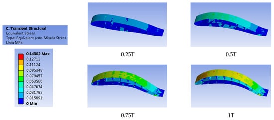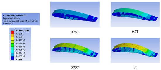 Figure 18 shows the deformation shape of the airfoil in one cycle. Figure 19 and Figure 20 show the structural stress of the airfoil with the Young’s modulus at 1 Mpa and 2 Mpa. The maximum deformation amplitudes of the airfoil are 104.31 mm and 55.20 mm, which equal to 10% and 5.5% of the whole chord length respectively. Their maximum deformation positions are both located in the middle part of the chord length direction. Figure 21 and Figure 22 demonstrate equal stress of the airfoil with the Young’s modulus at 1 Mpa and 2 Mpa. The maximum stress is 0.14302 Mpa and 0.14581 Mpa respectively. From the figures, it can be seen that the stress is mainly located in the first half part of the suction surface. While, the stress in the pressure surface is very small. By comparing Figure 21 and Figure 22, even though the deformation amplitude of the airfoil with the Young’s modulus at 1Mpa is larger than that of 2 Mpa, the corresponding stress is smaller, which is more suitable for the structure of the deformable airfoil.