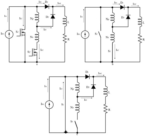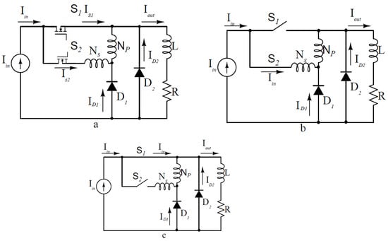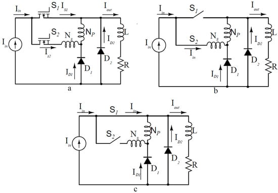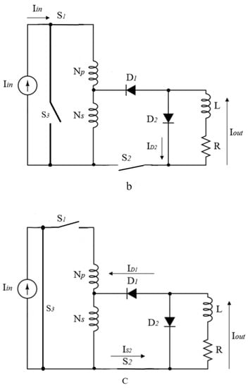Tapped-inductor Boost current converter topology and its operation states. (a) Tapped-inductor Boost current converter topology; (b) S1 is in off-state and S2 is in on-state; (c) S1 is in on-state and S2 is in off-state.