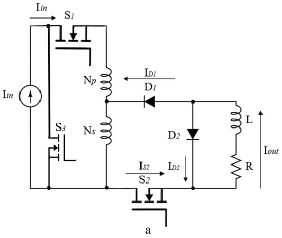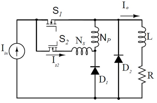 The introduced tapped-inductor boost converter topology as shown in Figure 6 consists of two active switches and , a tapped-inductor consisting of primary winding and secondary winding , two diodes and and an output inductive filter L. This new topology has a wider output current range when compared with the conventional boost current converter since the new topology adjusts the output current mainly based on the turns ratio, not duty ratio. Therefore, the current conversion ratio can be broadened when compared with the conventional boost current converter. Theoretically, the switching loss is reduced even under the same current conversion ratio of the conventional boost current converter. The , , , and are the parasitic components which are considered and involved in the simulations.