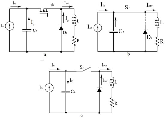 Conventional Boost current converter topology and its operation states. (a) Conventional Boost current converter topology; (b) S1 in on-state; (c) S1 in off-state.