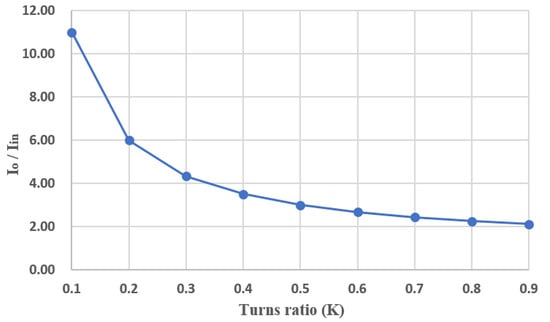 The tapped-inductor boost current converter is simulated and investigated. The parameters used is shown in Table 2. Figure 7 shows that the current gain of this new topology can achieve more than 10 times of the input current Iin when the turns ratio (K) was adjusted to 0.1. The minimum current gain of the new proposed topology can achieve 2 times of the input current when the turns ratio (K) is changed to 0.9. This current gain is slightly higher than that of the conventional boost current converter.