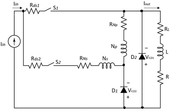 Figure 8 shows that the new introduced tapped-inductor boost current converter with parasitic components consideration. In this topology circuit, and are the equivalent series resistance (ESR) of Primary winding and Secondary winding respectively. The and represent the on-state resistances of the active switches and respectively. The represent the ESR of the Output inductive filter L. The and are the maximum forward voltage drop of the Diodes and separately. The detailed parasitic components parameters are listed in Table 3.