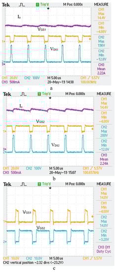 Figure 10a,b shows that when the gate voltages applied to the switches, the switches turned on. Therefore, the drain voltages of the switches dropped to the minimum values. In the other hand, when the gate voltage did not apply to the switches, the switches turned off. The drain voltages of the switches increased to the maximum values. In Figure 10c, it shows that switch and are operated in pair. One switch turns on, another switch will turn off.