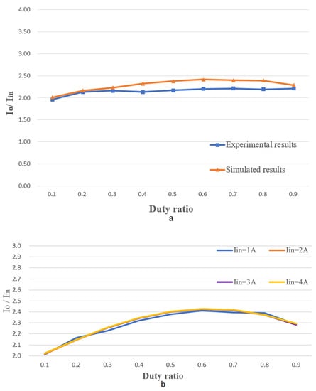 Analysis the current gain of the Tapped-inductor boost current converter with duty ratio. (a) Comparison of the current gain in between the simulated results and the experimental results ( = 1 A and R = 5 ); (b) Simulated results of the current gain with different input currents.