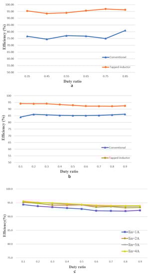 Figure 13a shows that the power conversion efficiency of the tapped-inductor boost current converter can keep around 95% with duty ratio from 0.35 to 0.85. The range of duty ratio less than 0.35 and over 0.85 is not practical for real converters. The power conversion efficiency of the tapped-inductor was much higher when compared with the conventional boost current converter. The maximum power conversion efficiency of the conventional boost current converter can only acquire around 80% using the same design. Hence, it can be observed that the power conversion efficiency of Tapped-inductor boost current converter is much higher than that of the Conventional boost current converter. Figure 13b shows the theoretical behaviour which the loss and thermal variation of equivalent resistance of the capacitors and inductors has not been taken into account. Based on the Figure 13b results, it is observed that the tendency of the experimental and simulated results of the conventional boost and tapped-inductor converters are similar. Moreover, the experimental results only are slightly different from the simulated results because the loss in simulation has not considered all the passive losses. The input current effect has also been investigated in this paper. The Tapped-inductor boost current converter is simulated under different input current to explore the variation of the power conversion efficiency of the Tapped-inductor converter. Figure 13c shows that the power conversion efficiency has not been changed significantly even the is changed along with in the range from 1 to 4A. Moreover, the power conversion efficiency remains above 90% with the changed along from 1 to 4A.