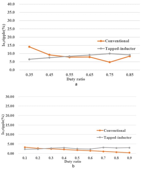Figure 14a,b shows that the tapped-inductor boost current converter obtained less output current ripples along with the duty ratio from 0.35 to 0.85 when compared with the conventional boost current converter. Figure 14a,b shows that the new topology maintained the output current ripple below 10% with the duty ratio range from 0.35 to 0.85. However, the conventional boost current converter did not succeed as the Figure 14a shown. The output current ripples of the conventional boost current converter are higher than the new introduced topology under some duty ratios as the Figure 14a The maximum output current ripple of the conventional boost current converter reaches nearly 15% when the duty ratio at 0.35 as Figure 14a shown. This can show that the performance of the Tapped-inductor boost current converter is much better than the conventional boost current converter. In Figure 14a,b, the experiments and the simulations for investigating the output current ripples of the Tapped-inductor boost current converter have been conducted. The results can show that the experimental results are close and similar to the simulation results. Although the simulated results are slightly different from the experimental results because the passive components’ ESR has not been considered. The simulation also extends the range to 0.1 and 0.9 because the simulation can test the extreme duty ratio such as around 0.1 and 0.9 where the experiment cannot. The tendency of the curves is similar for all cases.