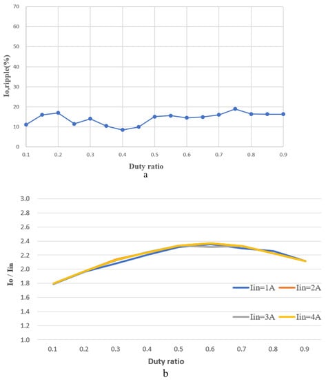 Figure 15a,b show the loading effect for the Tapped-inductor boost current converter. Figure 15a shows the experimental ripple at a fixed input current and output resistance. The ripple is around 10% to 20% that is acceptance for practical conversion. In Figure 15b, we observed that the current conversion ratio only had slightly changed even the output loading is doubled. These results can match with Formulas (23)–(30), the current conversion ratio depends on the turns ratio of the Tapped-inductor mainly. In the other words, the tapped-inductor boost current converter can remain the current conversion ratio in stable even the input current or the loading R is changed.