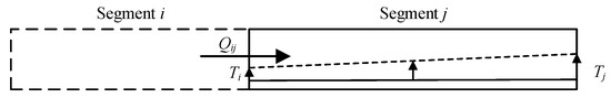 It can be seen from Equations (43) and (44) that if the heat strength of sub-source at different time is got, the thermal stresses on each segment can be obtained. Here we use an explicit way to calculate [31,33]. As fluid flows from segment i to segment j, the temperature becomes Tj from Ti (shown in Figure 2). The segment j draws thermal energy from surrounding rock, and acts as a negative heat source. For duration Δt (from tm to tm+1), the net volume entering segment j is written as: