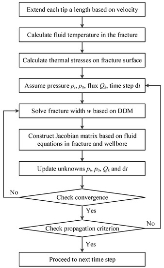 The whole process of hydraulic fracture propagation involves three physical fields, that are stress, pressure and temperature fields. Here, we adopt a strategy that stress (displacement discontinuity) and pressure are solved iteratively while the temperature and thermal induced stress are solved explicitly. The solving algorithm is illustrated as follows. For a new time step, each fracture tip is extended a length (Equation (33)) if the propagation criterion is satisfied. The temperatures on each fracture segment in previous time steps are solved (Equation (27)). The heat strengths of each fracture segment over previous time steps are calculated from equation (Equation (47)), and then the induced thermal stresses on each fracture segment can be obtained (Equations (43) and (44)). These thermal stresses are added to the total stresses on fracture segments (Equations (48) and (49)). After that, the fluid pressure and displacement discontinuities are solved iteratively. The unknowns include time step dt, fluid pressure pi, displacement discontinuities , injection rate Qk and fluid pressure p0. Considering that the equations between fluid pressure and displacement discontinuities are linear, we select the time step dt, fluid pressure pi, injection rate Qk and pressure p0 as iteration variables. The number of iteration variables is N + 2m + 2. We need to construct the same number of equations for the use of Newton iterative solution of the problem. The Newton iteration method requires that the iteration variables are given initial values. Based on the given fluid pressure and already evaluated thermal stresses on all fracture segments, the displacement discontinuities are achieved by solving Equations (48) and (49), in which the normal displacement discontinuities give the fracture widths of all segments. N equations can be deduced by substituting Equation (37) into Equation (36). 2m equations can be deduced from Equations (15) and (16). And 2 equations are obtained from Equations (13) and (14). The number of equations set and the number of iteration variables are equal. Therefore, the selected iterative variables can be solved by using Newton iteration method. The convergence criterion requires that the relative errors of iterative variables between consecutive iterative steps are less than the tolerance ε. Therefore, the criterion for the iterative scheme is expressed as |dtl+1 − dtl|/|dtl+1| < ε, |I − |/| | < ε, | − |/| | < ε, | − |/| | < ε, where l represents the iterative step. The tolerance is set as 0.001 in the study. After the convergence, the fracture propagation criterion is checked for each fracture tip. As illustrated in Section 2.4, it requires that the equivalent stress intensity factor exceeds rock toughness for fracture extending forward. Therefore, the equivalent stress intensity factor is calculated (Equation (32)), and compared with the rock toughness. If there is a tip satisfying the criterion, the program directly proceeds to the next time step. Otherwise, if the criterion is not met, the iteration is repeated with renewed fluid pressure. The flow chart of iterative scheme for a time step is shown in Figure 3.