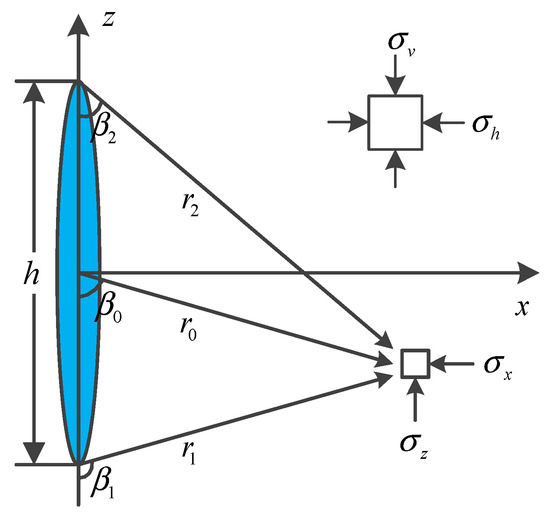 The first case is a vertical fracture case as shown in Figure 4, in which the fracture is imposed a constant fluid pressure inside. The fluid pressure would induce extra stresses around the fracture, and the induced stresses at arbitrary point is given as [34]: