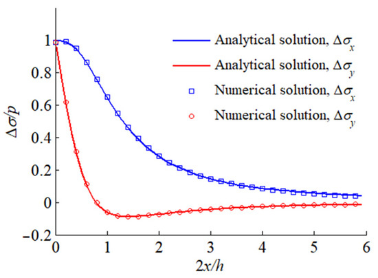 Comparison of the induced stresses between the numerical results and the analytical solution.