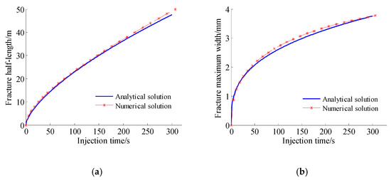 The hydraulic fracture half-length and width are solved numerically and analytically, which are shown in Figure 6. The results show that good consistencies are obtained.