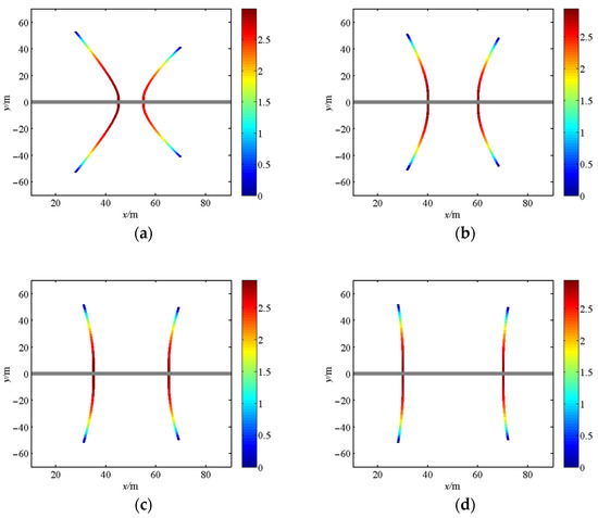 Fracture propagation paths and width distributions (mm) for different spacings. The grey thick lines represent the horizontal well. (a) 10 m, (b) 20 m, (c) 30 m and (d) 40 m.
