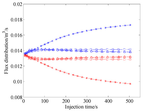 Evolution of flux distribution for different spacings. The curves marked with star, square, circle and triangle correspond to the cases with spacings from 10 m to 40 m. The curves colored by blue and red represent the flux for left fracture and right one.