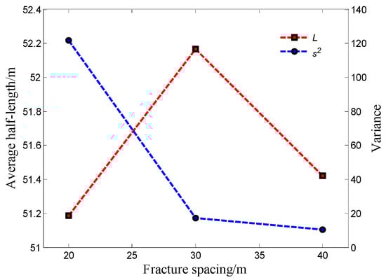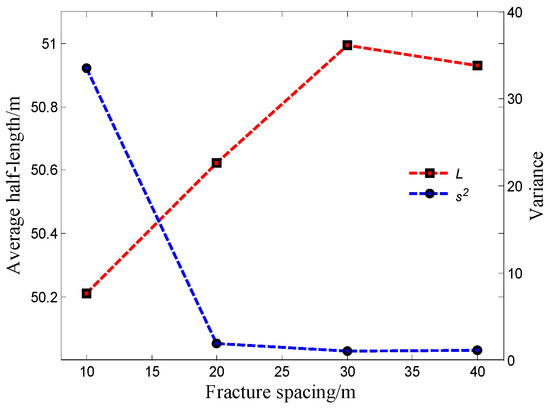 Moreover, the average half-length and variance for different spacings is shown in Figure 12. The average half-length with fracture spacing 30 m is slightly larger than that with fracture spacing 40 m. The reason is that larger frictional pressure drop is produced in the wellbore when using larger fracture spacing. However, as the fracture spacing increases, the variance of fracture half-length decreases.