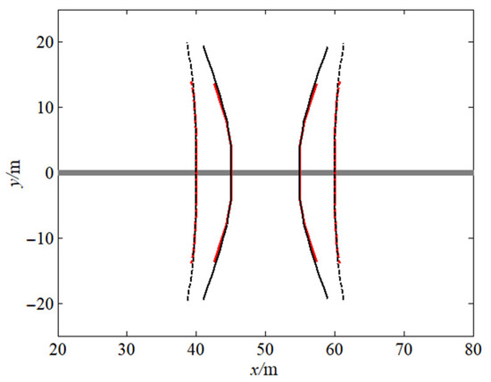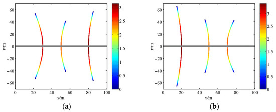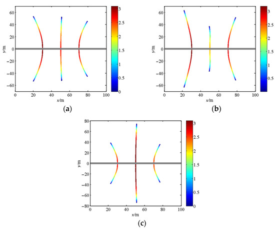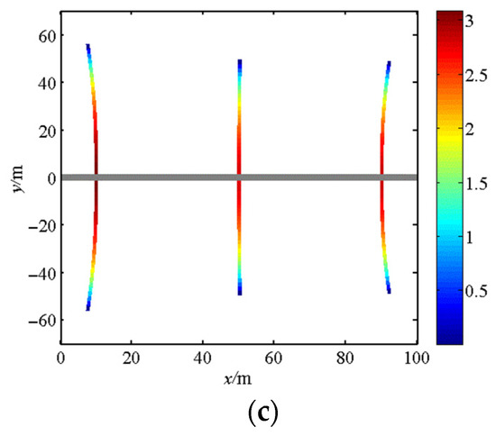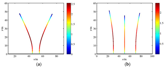 In above cases, two-wing fracturing is modeled. The single-wing fracturing is simulated in this section. Two-cluster fracture with 10 m spacing and three-cluster fracture with 20 m spacing are modeled under the condition of single-wing fracturing. The fracture propagation paths and widths distribution are shown in Figure 15. Compared with two-wing fracturing, the variance of half-length decreases from 33.5 to 0.06 for the two-cluster fractures and decreases from 121.9 to 7.4 for the three-cluster fractures. It indicates that single-wing fracturing could greatly improve the uniform growth of multiple hydraulic fractures.