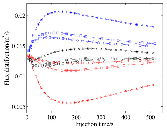 Evolution of flux distribution with different spacings. The curves marked with star, square and circle correspond to the cases with spacings from 20 m to 40 m. The curves colored by blue, red and black represent the flux for left fracture, the middle one and right one.