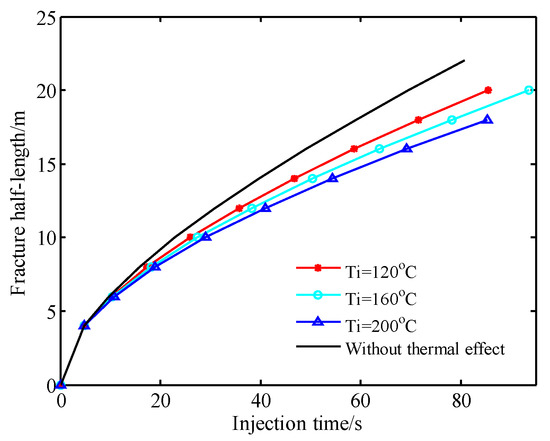 For the single fracture propagation case, the evolution of fracture half-length with different initial reservoir temperatures is shown in Figure 16. Compared with the case without thermal effect, considering thermal effect results in shorter fracture half-length at the same injection time. Furthermore, fracture half-length decreases as the initial reservoir temperature becomes higher. With higher initial reservoir temperature, it would give rise to greater thermal stress on fracture surface, which relieves the situ-stress on fracture segments. Given the same injection rate, larger fracture width would be obtained, and then shorter fracture length is got. It indicates that the thermal effect decreases fracture propagating velocity.