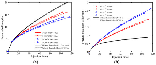 Regarding to two-cluster fracturing, similar phenomenon is observed in the evolution of fracture half-length with different initial temperatures as shown in Figure 17a when considering the thermal effect no matter what fracture spacing is chosen (10 m or 20 m). Correspondingly, the fracture width increases as shown in Figure 17b when considering the thermal effect. It indicates that the thermal stress has a significant influence on fracture geometrical size. On the other hand, the fracture propagation paths are drawn in Figure 18. Little difference can be seen between them, which indicates that the thermal stress has trivial effect on the fracture propagation path. The reason for this may be that the thermal induced stress is mainly concentrated around fracture surface, and greatly decays away fracture surface, which would not interfere the intrinsic stress shadowing between fractures.