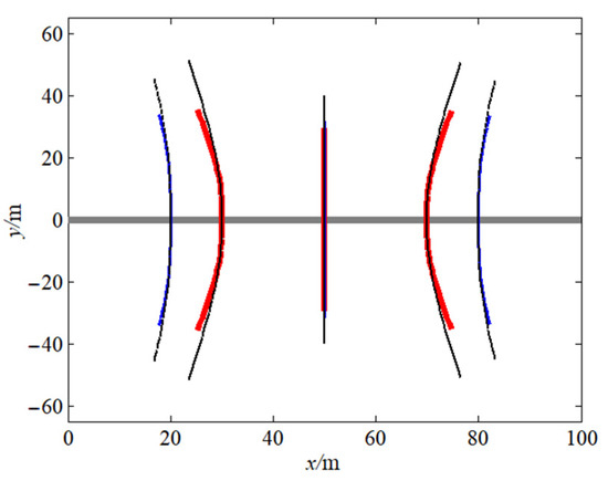 Comparison of fracture propagation paths between the case that considers thermal effect and the one without thermal effect. The red and blue lines represent the fracture paths for the cases that consider thermal effect with spacings of 20 m and 30 m. The curves colored by black represent the fracture paths for the case without thermal effect.