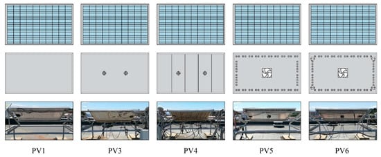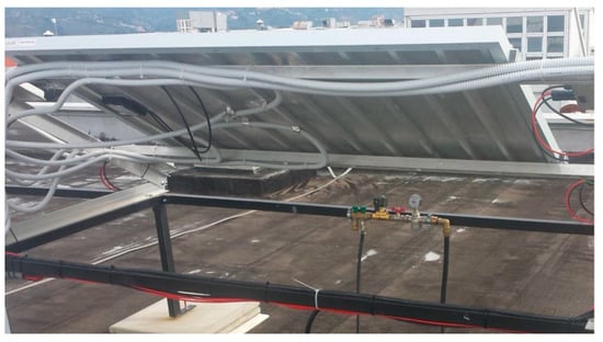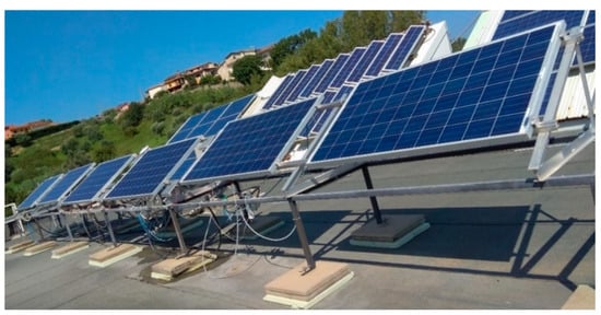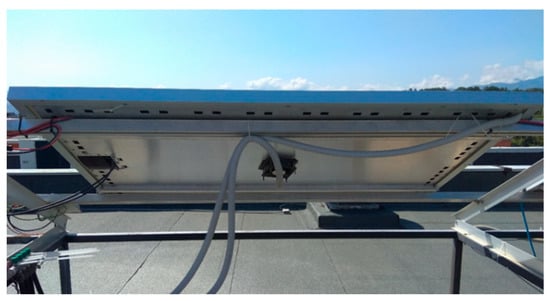 - Module PV4 was equipped with the same nozzles as PV3, distant approximately 50 cm from the module but with the addition of a thin metallic panel fixed on the back surface (Figure 2) in the attempt to improve temperature uniformity of the rear surface.