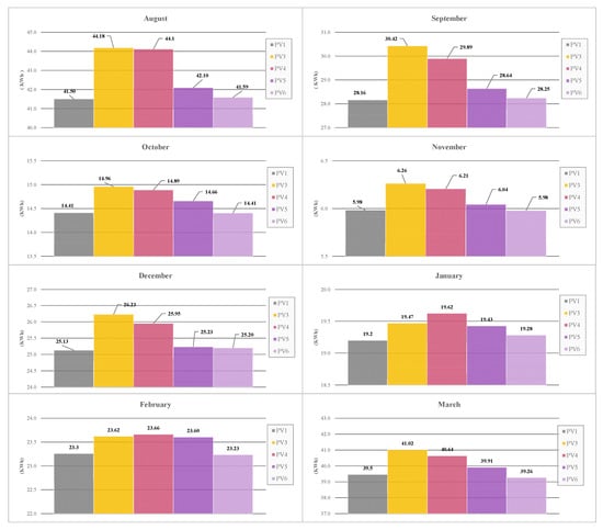 | Month | ΔPV3–1 kWh/month | ΔPV4–1 kWh/month | ΔPV5–1 kWh/month | PV3 €/month | PV4 €/month | PV5 €/month |