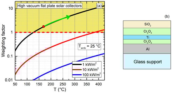 (a) Weighting factor versus absorber temperature T (C) for different solar concentration ratios. The red dot indicates the operating temperature (160 C) of High Vacuum insulated Flat plate solar thermal Panel (HVFP) equipped with commercial absorber and the green arrow the increasing importance of thermal emittance with working temperature (adapted from [13]). (b) Schematic structure of the multilayer under study. From bottom to top: glass substrate, aluminum film (250 nm) and its natural oxide, Chromium oxide Cr2O3, Titanium Ti, Chromium oxide Cr2O3 and silicon dioxide SiO2.