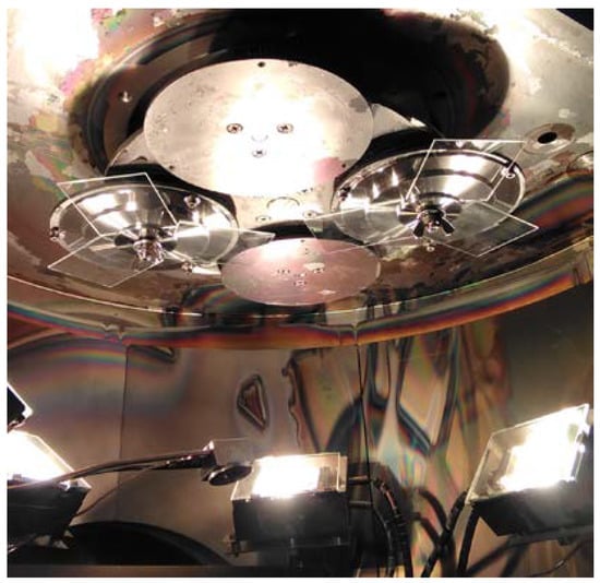 The materials composing the multilayer solar absorber coatings were deposited on smooth glass substrates (roughness 1 nm) using e-beam evaporation physical deposition technique. The glass slides (TED Pella inc. #260230 made from optical grade soda lime glass) were cut in pieces of 25 mm × 50 m and cleaned using soapy water and ultrasonic washing in acetone and isopropanol baths. Substrates temperature was monitored during the deposition process and it never exceeded 80 C. The e-beam system used is equipped with a rotating planetary that guarantees the samples thickness uniformity and the deposition of several substrates in the same conditions (see Figure 2).