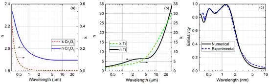 (a,b) Complex refractive index for Cr2O3 and Ti respectively: real part n on the left axis, imaginary part k on the right axis. (c) Emissivity curve of Cr2O3/Ti/Cr2O3 multilayer: experimentally measured absorptance (blue dotted line) and numerical simulation (black line).