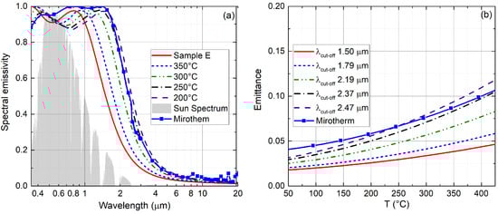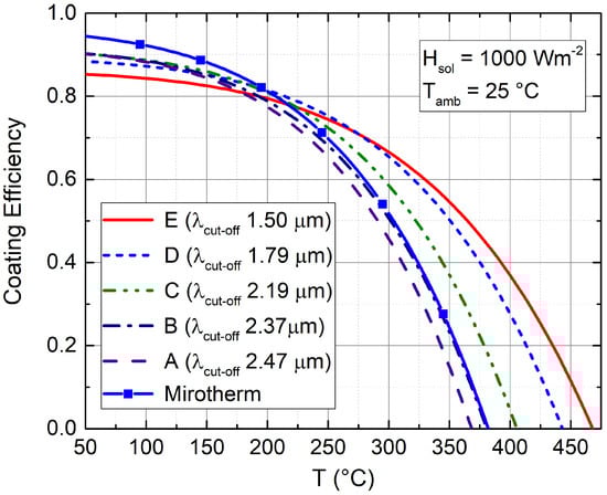 In Figure 5 is also reported the efficiency of sample E, whose spectral emissivity was designed to have a μm. Its cut-off is outside the typically explored wavelength interval, since it corresponds to a region of zero intensity in the Sun spectrum, one of the so-called hidden regions [13]. Despite the relative low absorptance of sample E (0.86 respect to 0.95 for Mirotherm), starting from 220 C, its coating efficiency is higher than Mirotherm thanks to its lower thermal emittance (0.029 respect to 0.067 of Mirotherm).