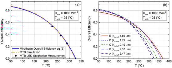 (a) Overall efficiency versus Absorber temperature T (C): Mini-Test-Box (MTB) simulated efficiency (orange, dash dot), Led Measured MTB efficiency (black dots), Mirotherm® overall efficiency calculated using Equation (8) (blue solid line). (b) Overall efficiency calculated using Equation (8) for coating having cut-off as reported in Table 1 (see legend).