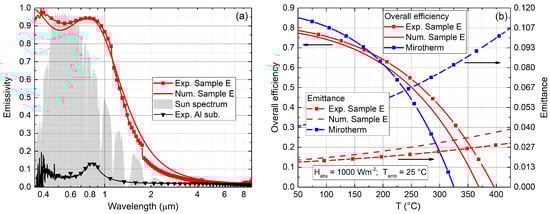(a) The experimentally measured (red line with square markers) and numerically simulated (red line) spectral emissivity of the multilayer E. Black line with diamond markers is the experimentally measured spectral emissivity of the aluminum on glass substrate whereas the grey area represents the normalized Sun Spectrum. (b) Thermal emittance as function of temperature (right axis). On the left axis is reported the overall efficiency of the collector as function of absorber temperature according to Equation (8): = 1000 Wm, and = 25 C, with for the industrial aluminum substrate used in Mirotherm.