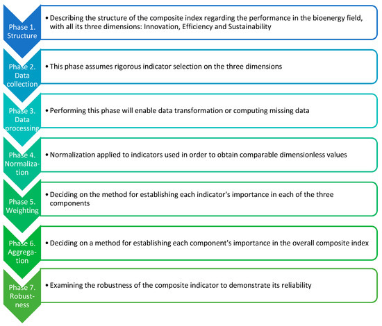 To our knowledge, there are few indexes designed for performance in the renewable energy field, such as the Environmental Performance Index (EPI) [3], the Aggregated Energy Security Performance Indicator (AESPI) [4], Renewable Energy Responsible Investment Index (RERII) [40], and Renewable Energy Country Attractiveness Index (RECAI) [42], but none directly related to bioenergy performance. We were able to find the Nexus index [43], which deals with the efficiency of biofuels production from a specific crop and Renewable Energy Sustainability Index [44] which reveals the sustainability level achieved by countries in the renewable energy field. However, the performance concept, as we defined it in the previous section of the paper, is more complex, including efficiency, and sustainability as components. Thus, the novelty of this research lies in the construction of the performance assessment framework through seven phases, as presented in Figure 1, and in obtaining, in the end, a new analytical tool: The Performance Index in the bioenergy field.
